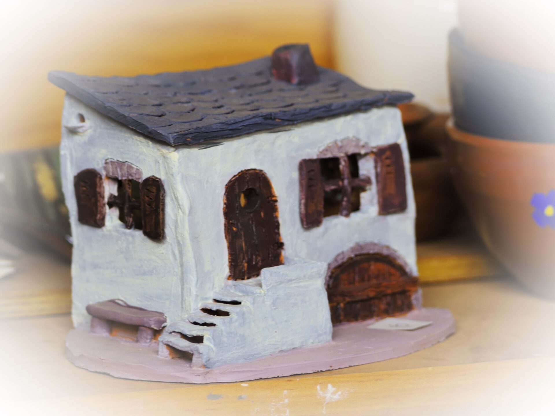Notre atelier se situe sur la place de l’église à Guillaumes. Nous disposons d’une salle de travail, d’une salle de stockage et d’une salle de cuisson avec deux fours électriques. Annie anime avec flamme et entrain cet espace traditionnel marqué par le temps dans une vieille maison. Karine et Jean Marc y donnent des cours chaque semaine et animent des stages.
